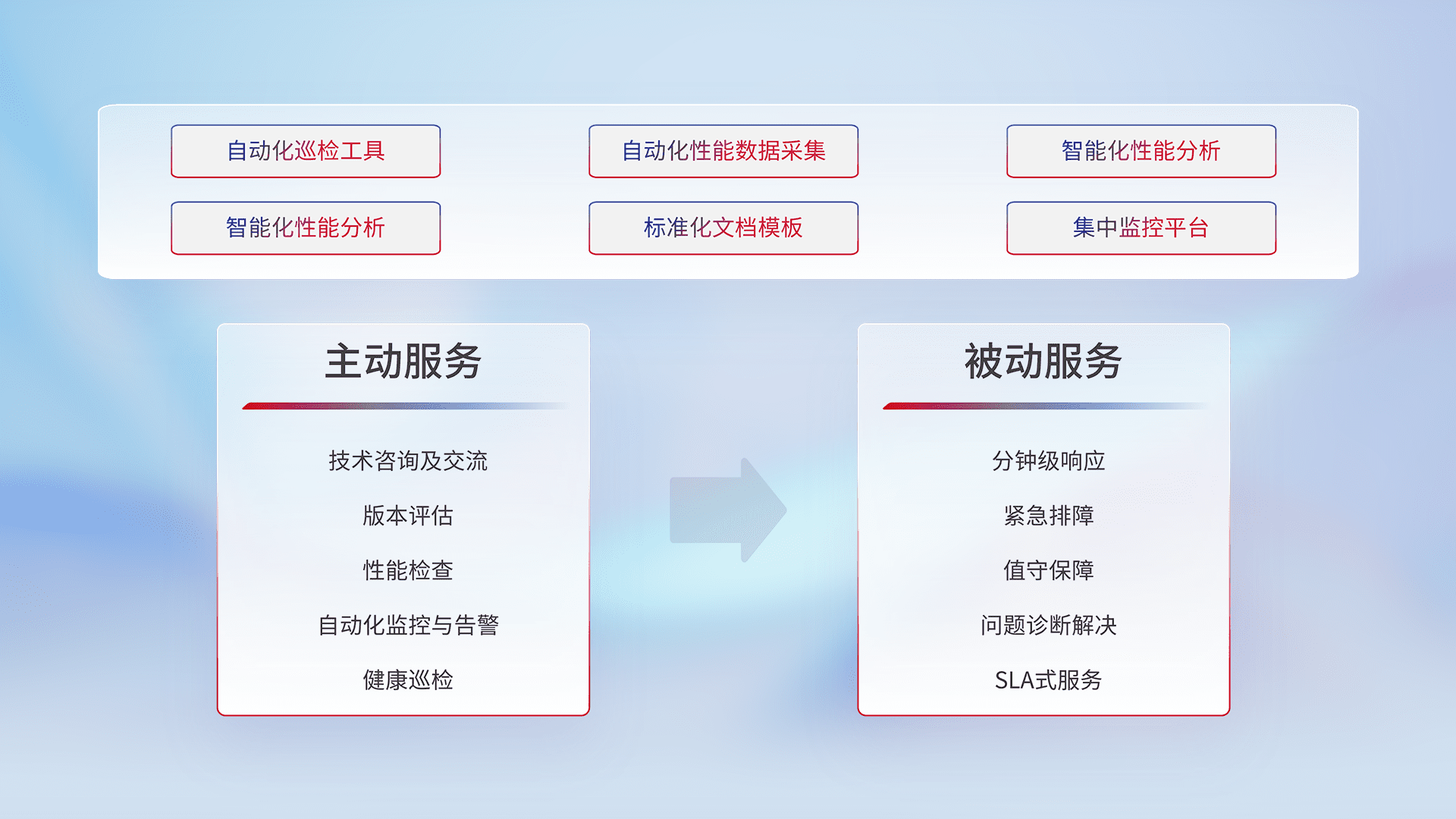 智能化工具和标准化文档,,保障服务质量,,,,提供主动服务(包含技术咨询、、、、版本评估、、、性能检查、、、、自动化监控与告警、、、、健康巡检)和被动服务包含(分钟级响应、、、、紧急排障、、值守保障、、、、问题诊断解决、、SLA服务)。。。。